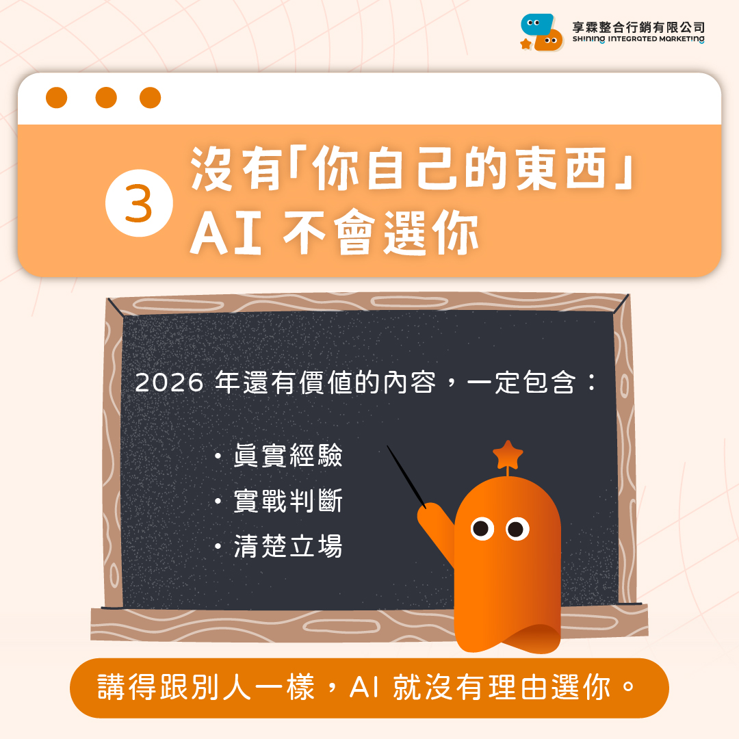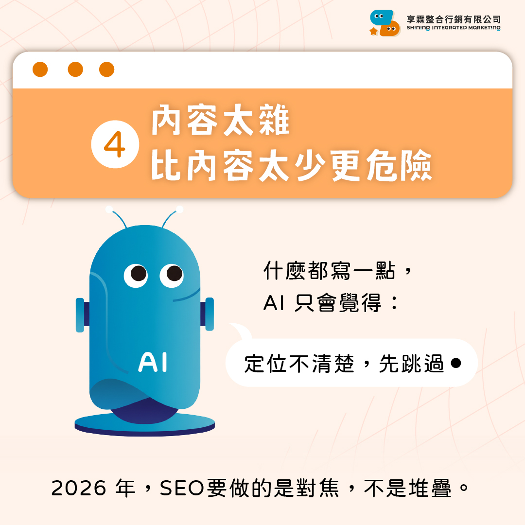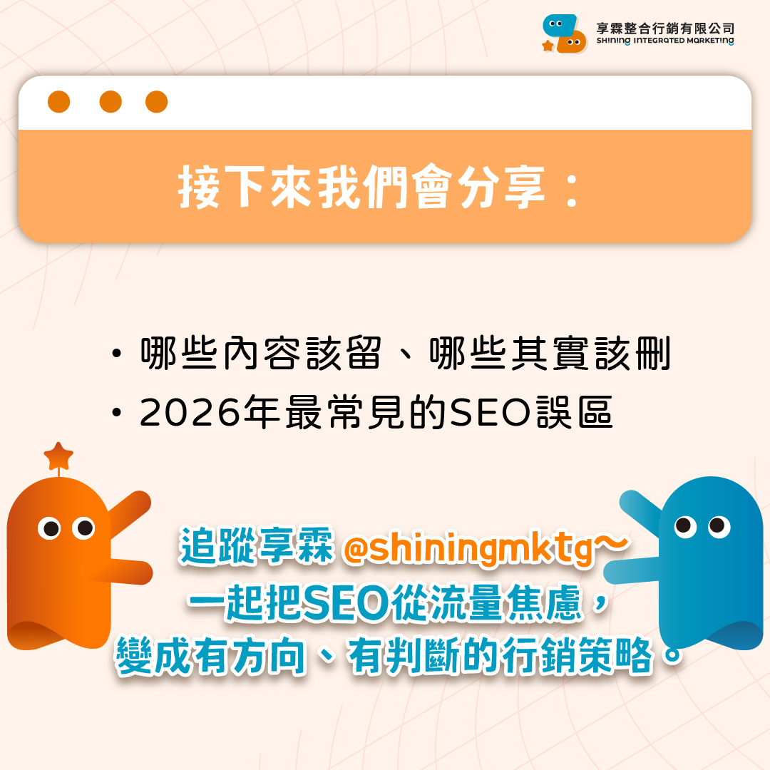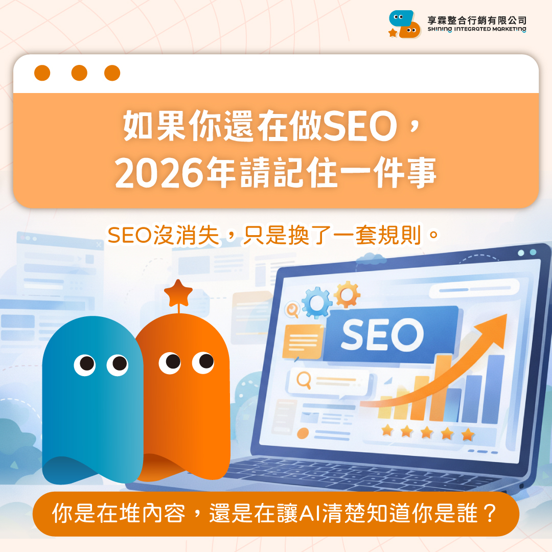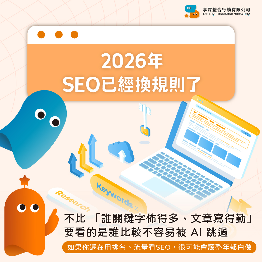 2026年的 SEO已經不是「關鍵字塞得多、文章寫得勤」就能贏的遊戲。因為搜尋流程正在改變:使用者搜尋後,往往先看到 AI 直接整理答案,只有在需要更深入時才點進網站;這也意味著,SEO的新目標不只是排名,而是讓內容成為AI會引用的來源。如果你還用「排名、流量」判斷SEO有沒有用,很可能整年都在做白工。
