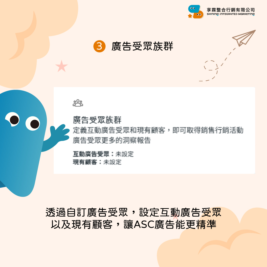 廣告受眾族群:透過自訂廣告受眾,設定互動廣告受眾以及現有顧客,讓ASC廣告能更精准