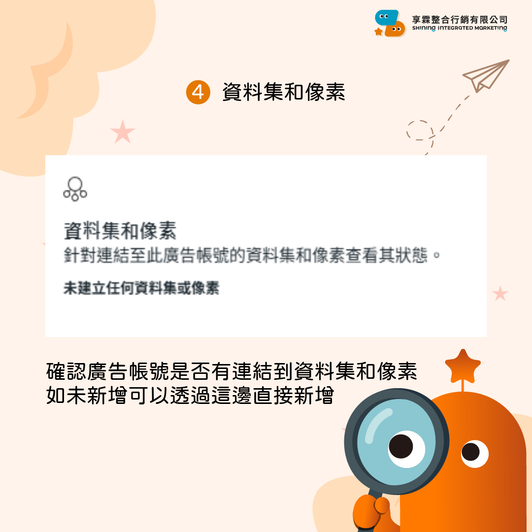 資料集和像素:確認廣告帳號是否有連結到資料集和像素,如未新增可以透過這邊直接新增。這邊有詳細介紹什麼是像素![]()