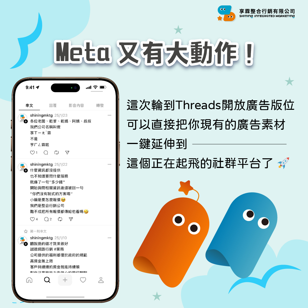 自 2025 年 4 月起,Meta 正式在全球範圍內推出 Threads 廣告功能,台灣市場亦同步開放。這項新功能使品牌能夠透過 Meta 廣告管理員,將現有的廣告活動延伸至 Threads 平台,無需額外製作素材。Threads 作為一個主打輕社交、低干擾的社群平台,已吸引超過 3.2 億月活躍用戶,特別受到年輕族群的喜愛。本文將深入解析 Threads 廣告的三大目標與三重策略,協助品牌在這個新興平台上有效觸及目標受眾。